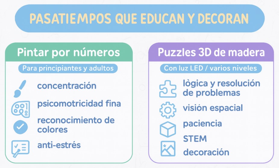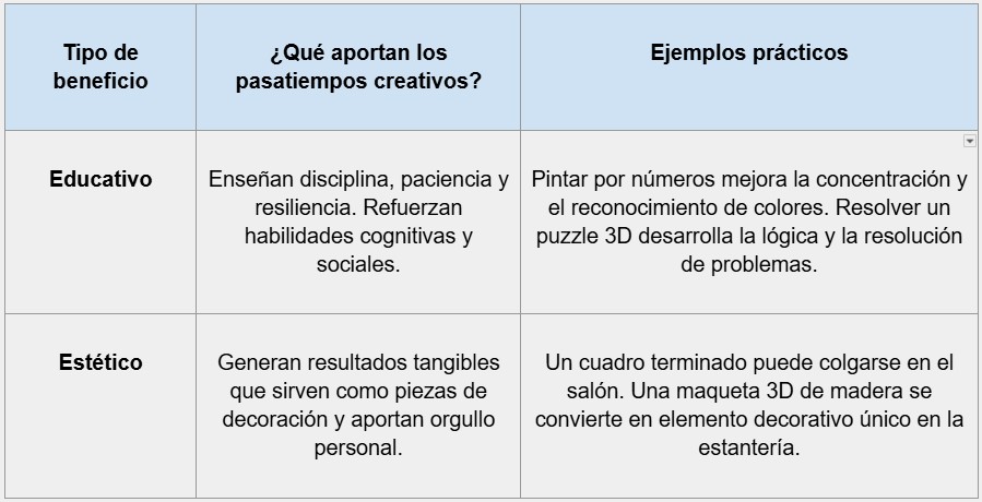 La pintura con números y los rompecabezas 3D de madera no solo entretienen, también aportan beneficios concretos. Para verlo de un vistazo, resumimos sus aportes educativos y estéticos en la siguiente tabla: